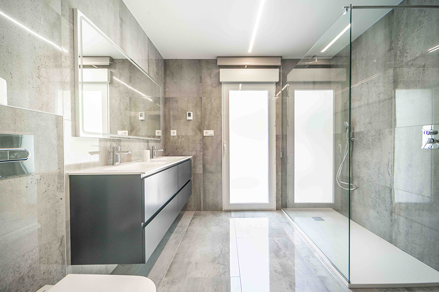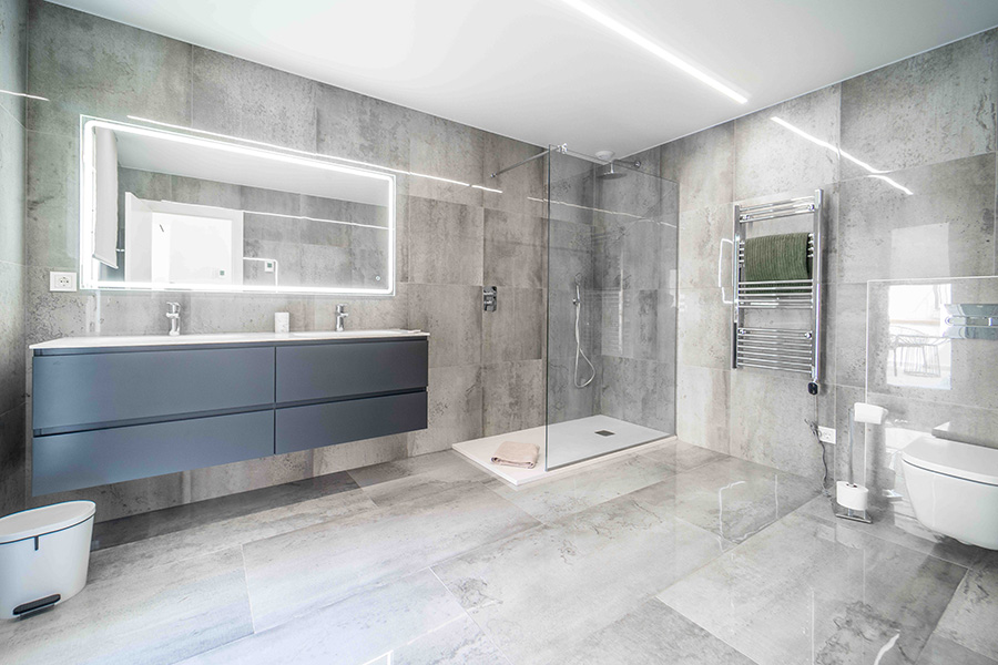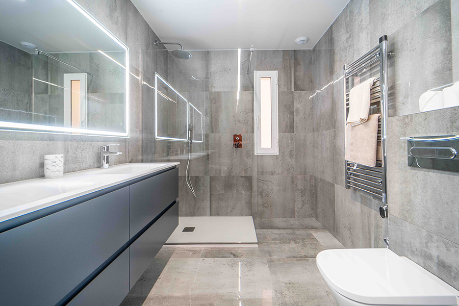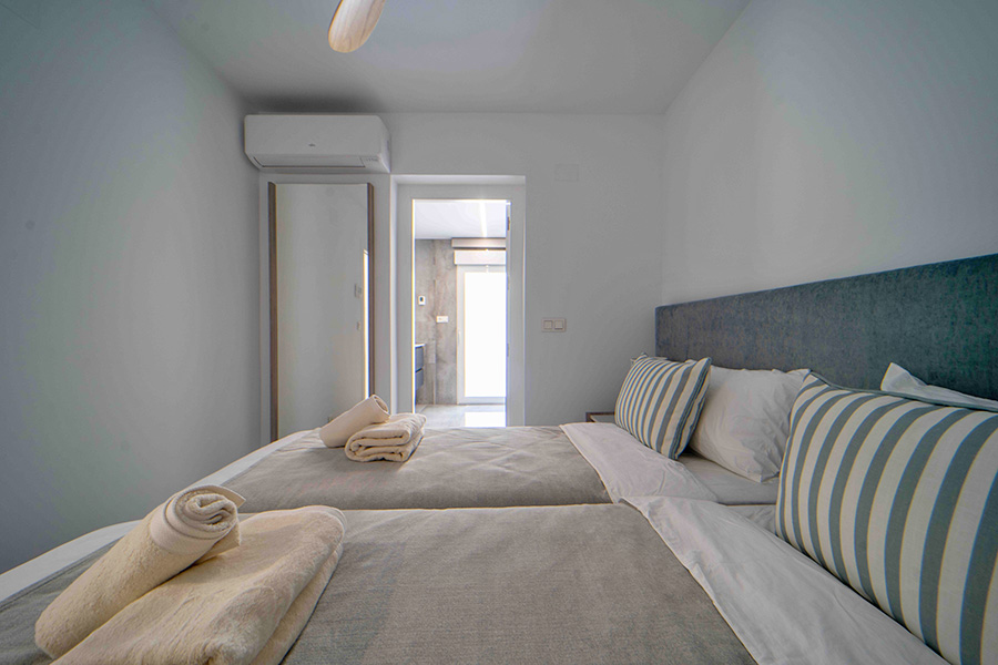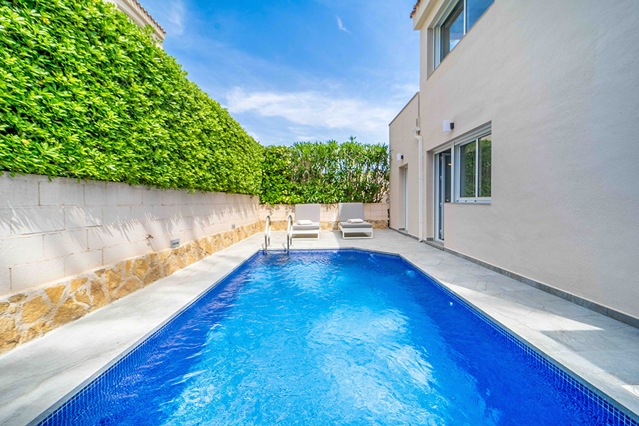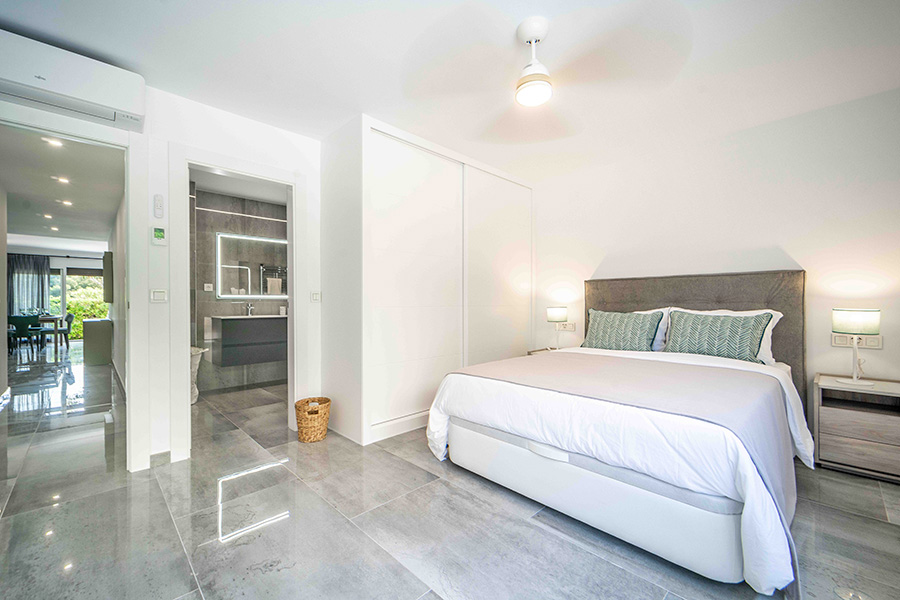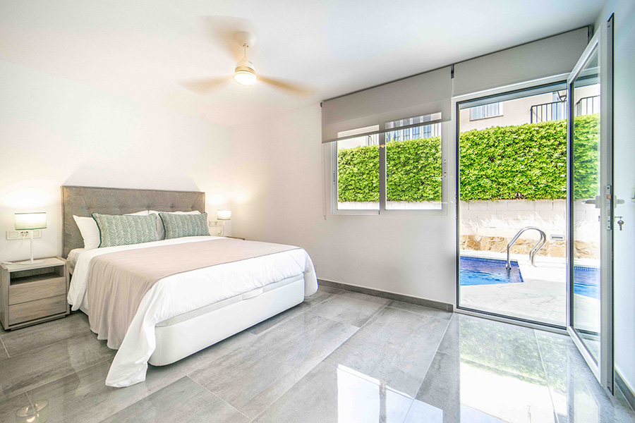 Bedroom one on the ground floor has a double bed, en-suite bathroom with walk-in shower, twin basins and wc. The bedroom has a door to the walled poolside terrace with sun loungers, the perfect place to relax in your Spanish holiday home.