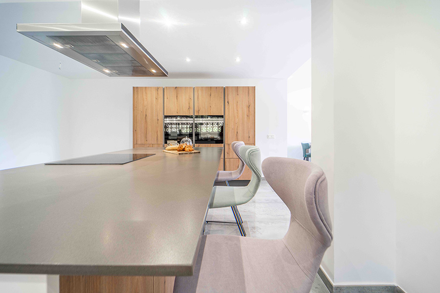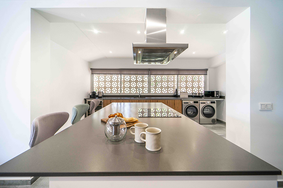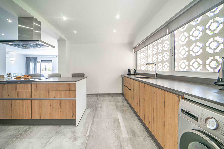 The stylish modern open plan lounge, dining room and kitchen on the ground floor has a comfortable sofa and satellite or cable smart TV with a large selection of TV stations. There is a dining table and chairs and patio doors to the ground floor terrace which leads to the private outdoor swimming pool. Back inside the modern kitchen is well equipped with oven, hob, extractor fan, dishwasher, microwave, fridge freezer and washing machine. There is an island with bar stools.