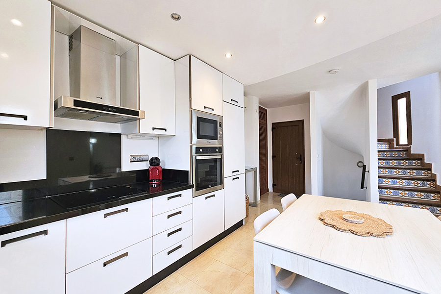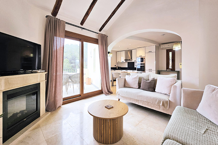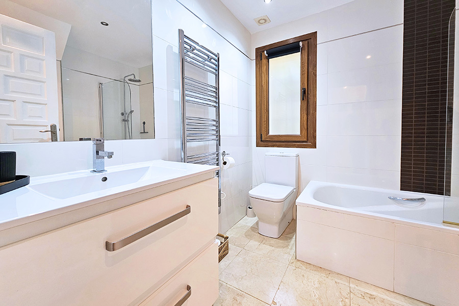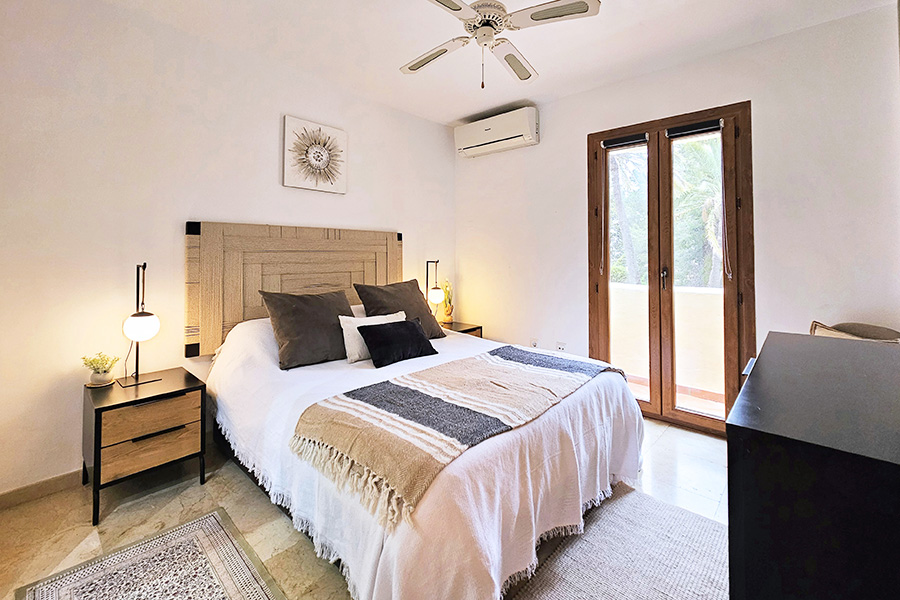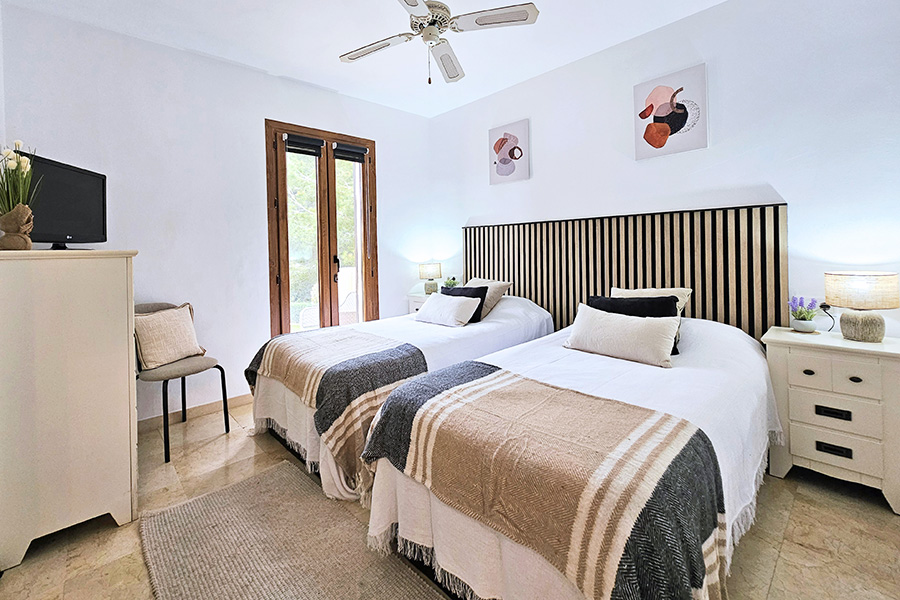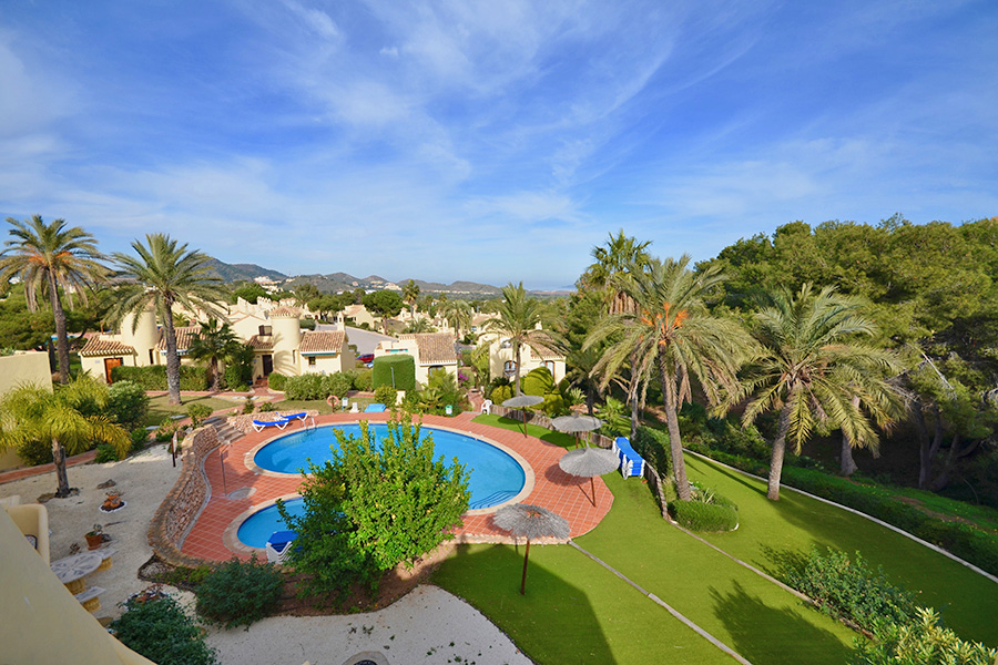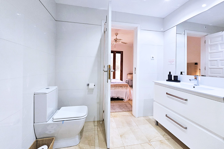 From the lounge there is a staircase down to the bedrooms and bathrooms. The master bedroom has a double bed, an en-suite bathroom and has patio doors to a ground floor terrace which is next to one of the communal swimming pools and the gardens. The second bedroom has a twin beds and also has patio doors to the ground floor terrace with access to the pool and the gardens. This bedroom has the use of separate bathroom. There is a washing machine in a hall cupboard.