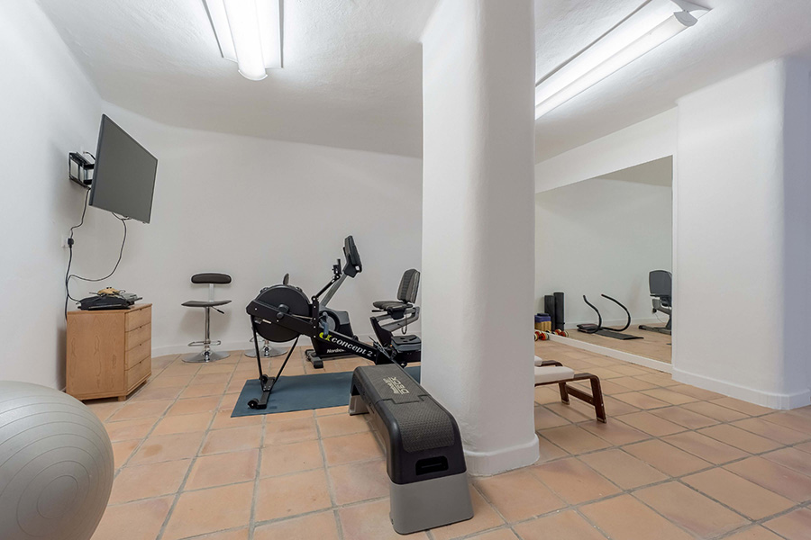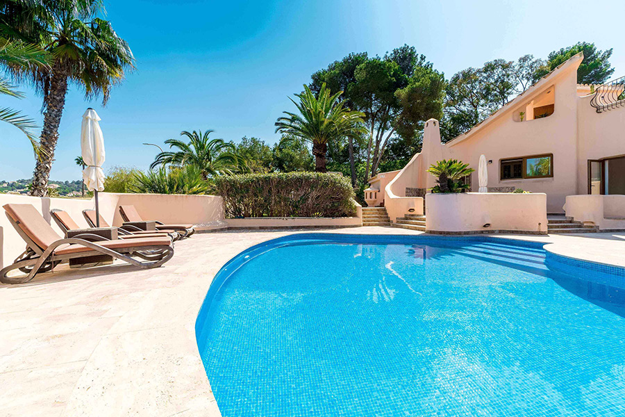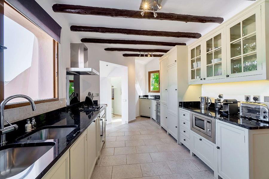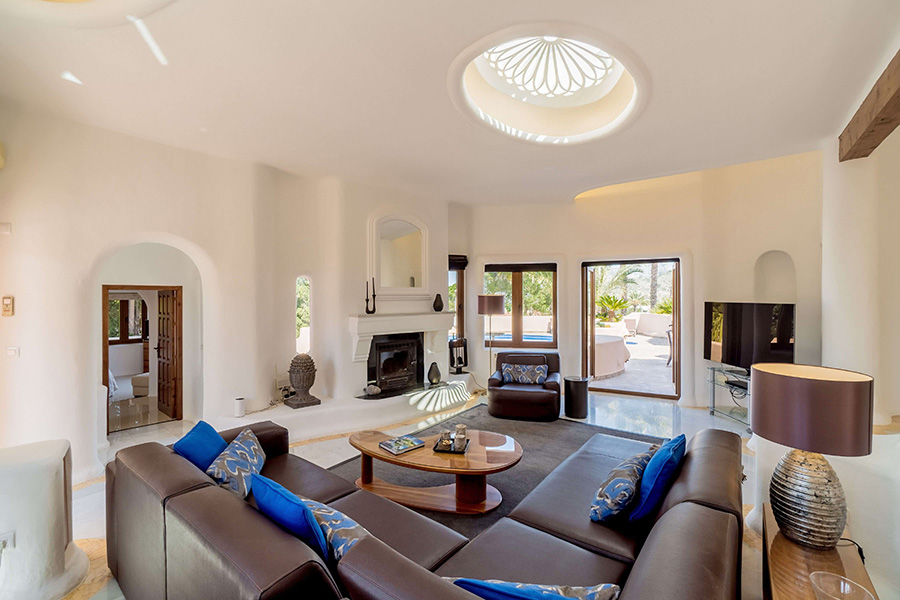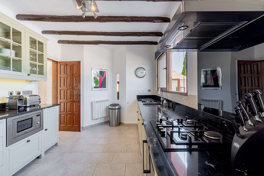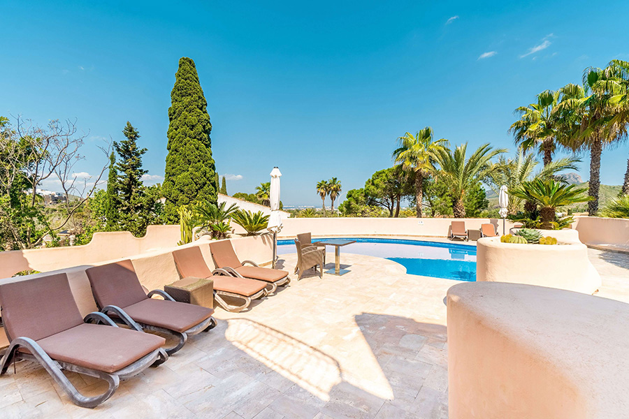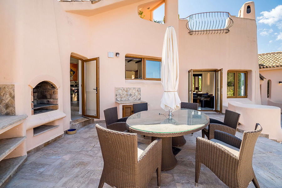 This villa is secluded with a gated entrance and walled terrace areas. It has a private freeform swimming pool, outdoor dining area and barbecue, outside lounge area with sofas and sun loungers. It also has a private gate into the Racquets Club.