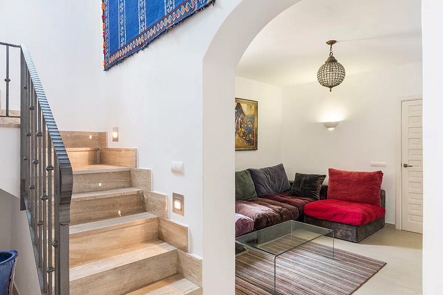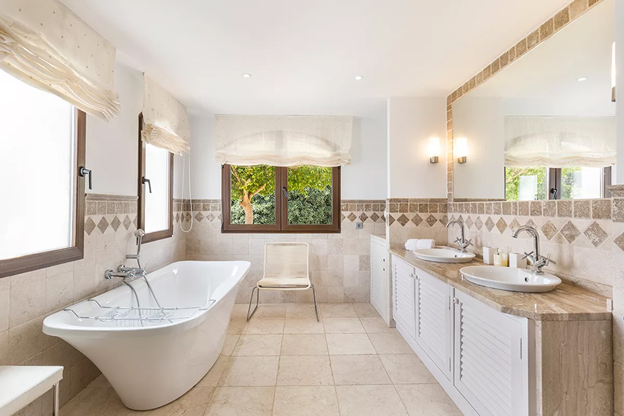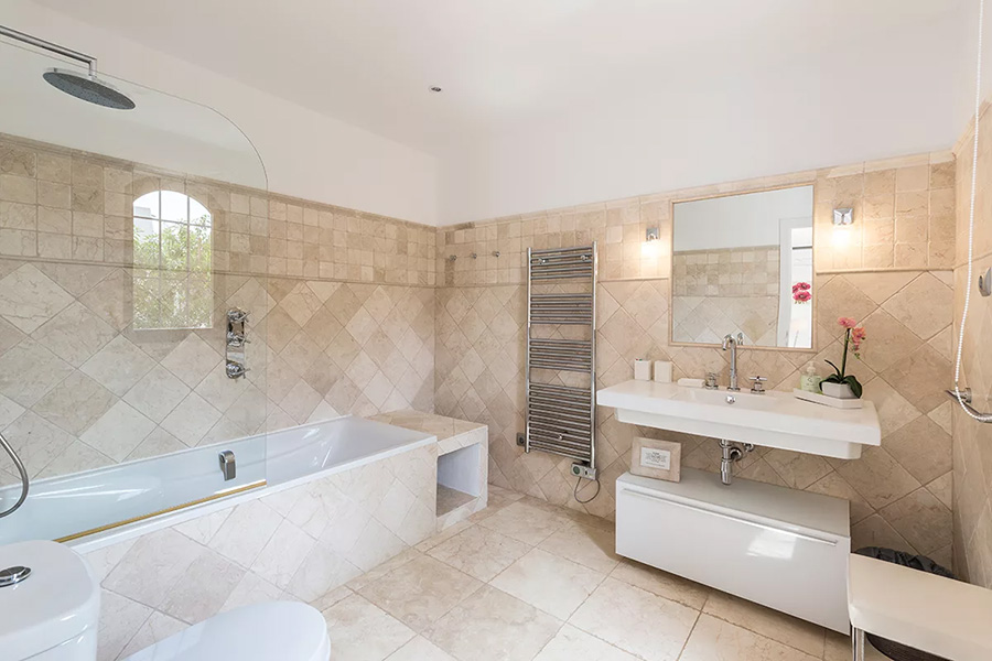 Upstairs, the Master Bedroom (not pictured in the image gallery) has a large double bed, patio doors to an upper terrace, en-suite bathroom, twin sinks, walk-in shower, large free standing bath and wc.