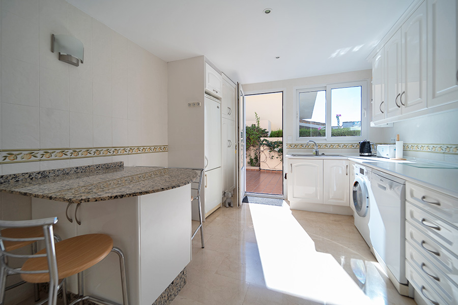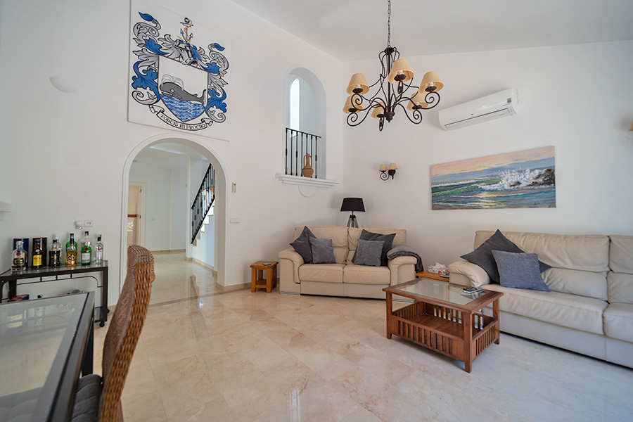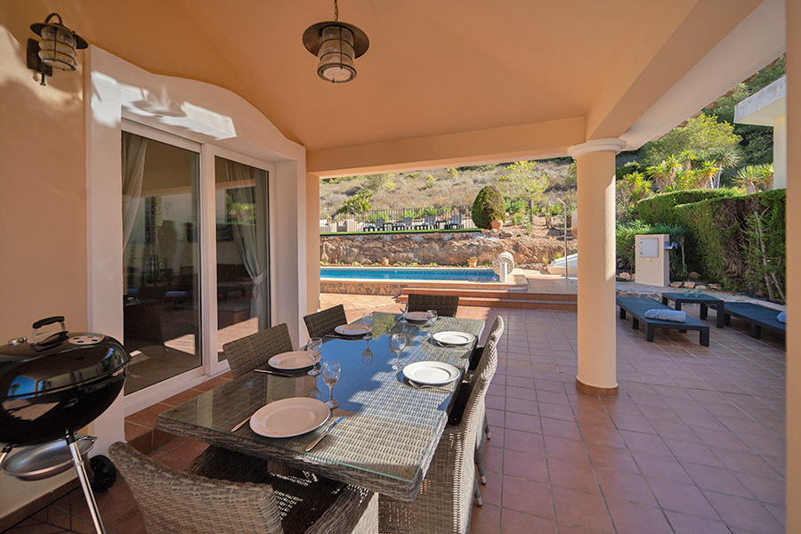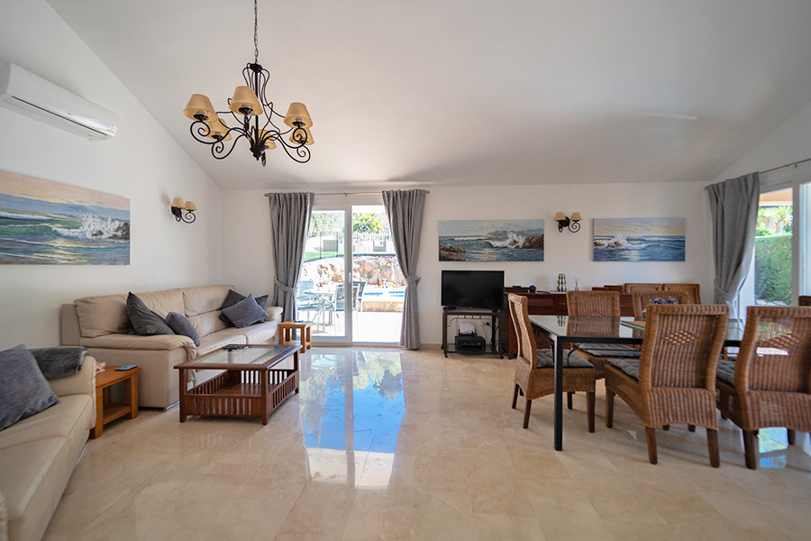 The open plan lounge and dining room has comfortable sofas and satellite or cable TV and an indoor dining area with seating for 6 to 8 persons. This large room has a high ceiling and dual aspect patio door access to the poolside terrace and private pool area which is perfect for outdoor dining, barbecuing or just relaxing on the sun loungers.