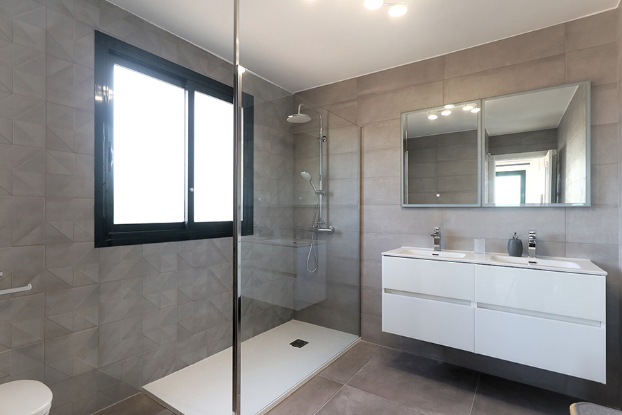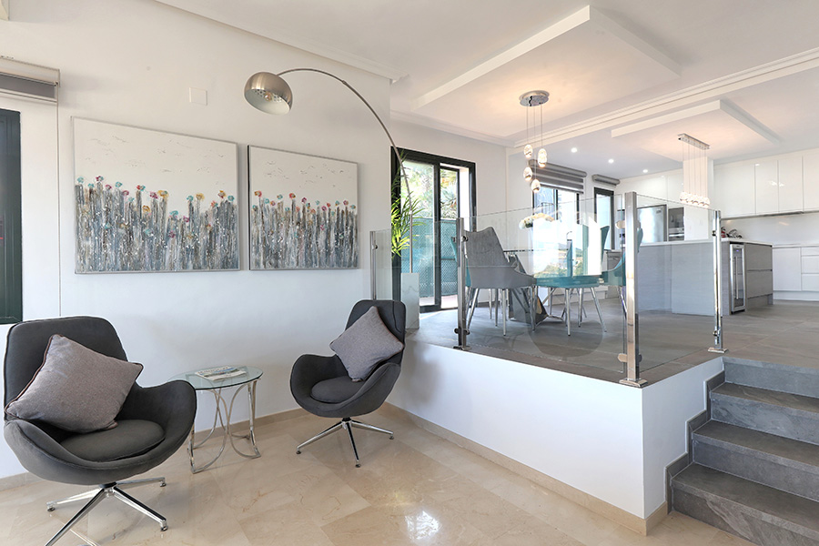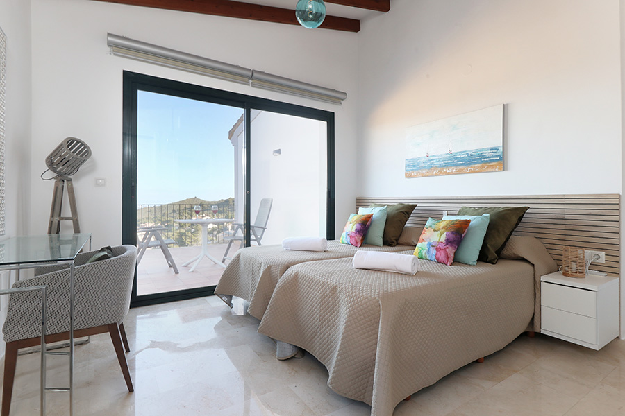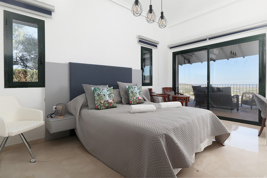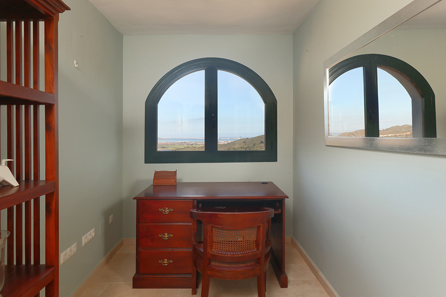 Enter the villa at the upper level where you can find bedroom two with a double bed an en-suite shower room and patio doors to a private terrace with table and chairs and fabulous views. Also on this level is bedroom three with twin beds, which can be made as a double if preferred, an en-suite shower room, and patio doors to a private terrace with table and chairs and those great views. Still on the upper level is an office area with desk and chair and a picture window with far reaching views, perfect for those who still have to work occasionally whilst on holiday!