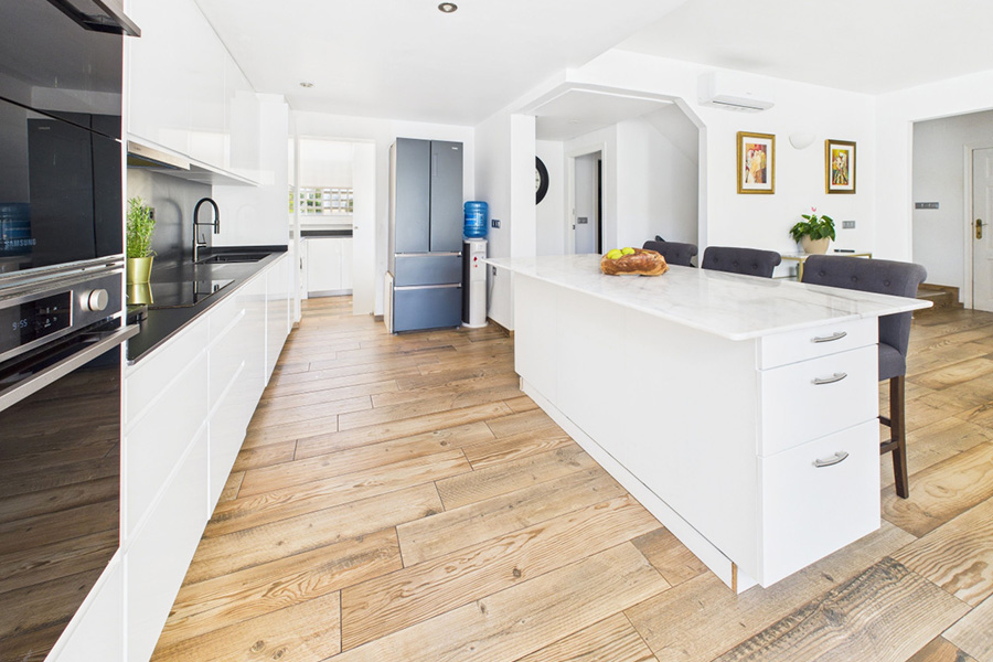 The super kitchen has oven, hob, dishwasher, microwave, fridge freezer, toaster and kettle. It has a large island with breakfast bar and bar stools. There is a utility room off the kitchen with a washing machine.