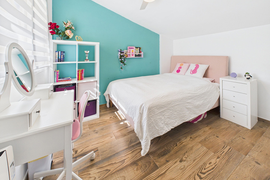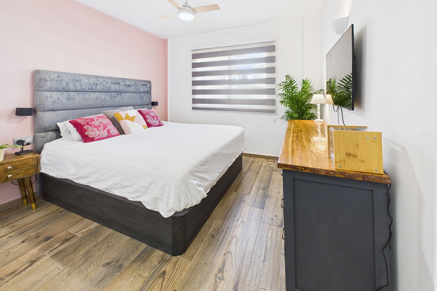 Master bedroom with king size double bed. Bathroom 1: Walk-in shower, twin basins and wc.