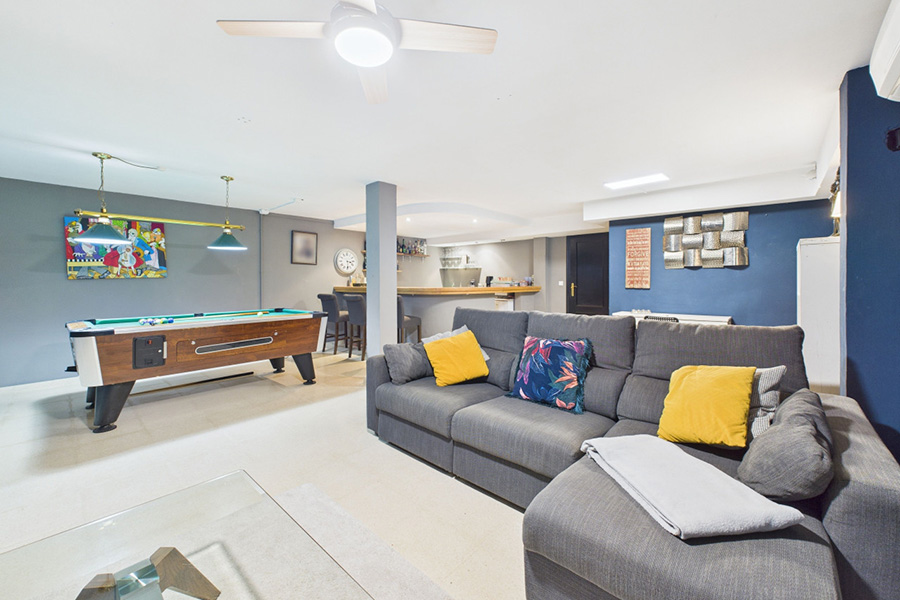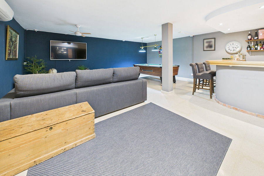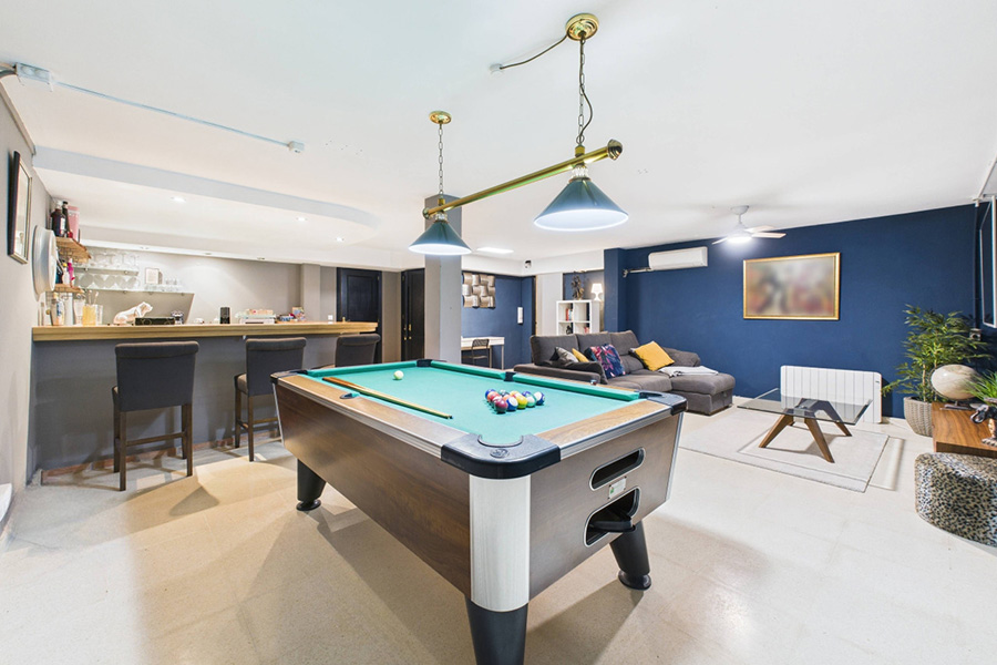 Open plan lounge, games room and bar: Furnished with sofas, coffee table, satellite or cable TV, pool table and bar with bar stools.