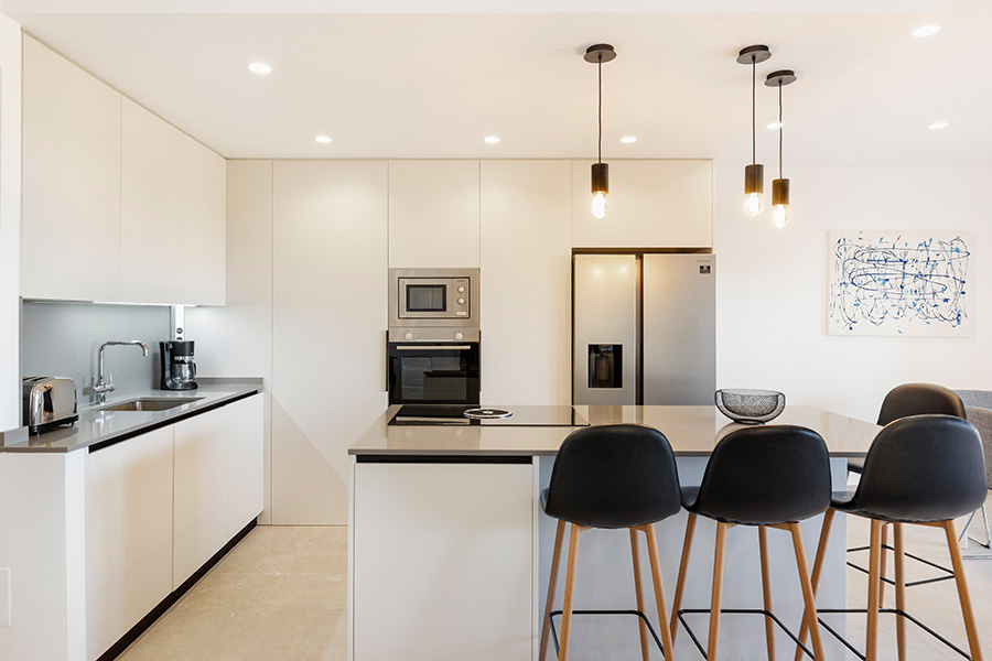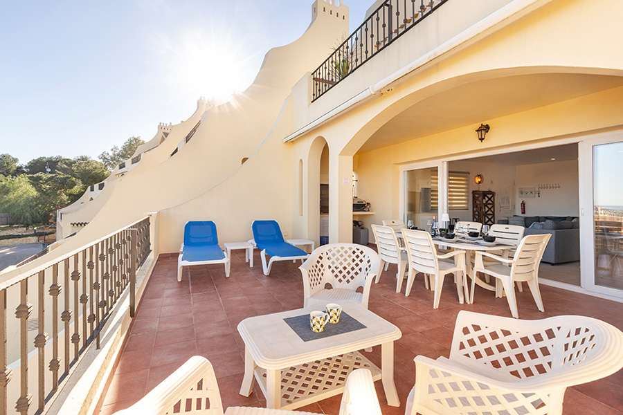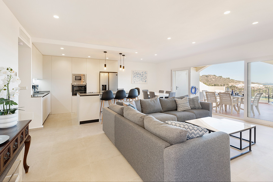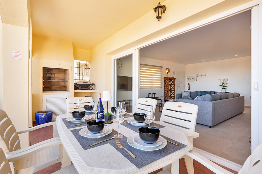 The spacious open plan lounge, dining room and kitchen has a wall mounted smart TV with satellite or cable services and also allowing you to connect to your own streaming subscriptions. There is a dining room table and chairs to seat six persons and patio doors lead to a large terrace with beautiful views. A gas barbecue and table and chairs are available for you to enjoy al fresco dining, or just relax on sun loungers. The kitchen area of this room is fully equipped with a washing machine, dish washer, microwave, oven, hob and extractor fan, fridge freezer and an island with bar stools.