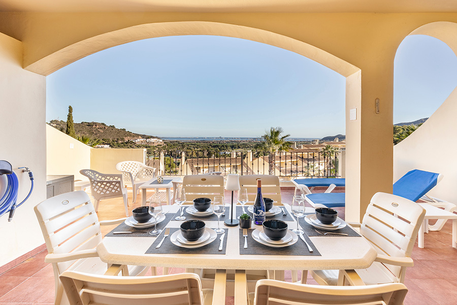 Situated in the top row, this fully refurbished 1st floor apartment has three bedrooms and three bathrooms and has views of La Manga Club and beyond to the Mar Menor. The apartment is all on one level and has a large private terrace with gas barbecue, it is well furnished and equipped. Free wifi internet access.