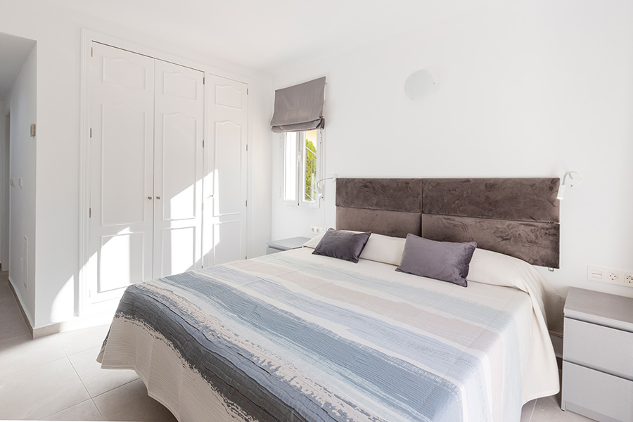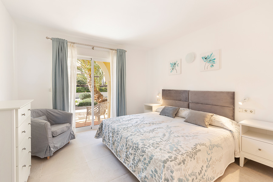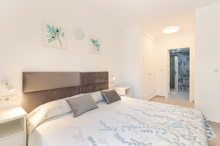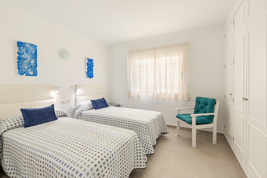 The master bedroom has a double bed, patio doors and an en-suite bathroom with bath, separate walk-in shower, twin basins and wc. The second bedroom has twin beds which can be made into a super king size double if preferred, patio doors to the rear of the apartment with small terrace and and en-suite bathroom with shower, twin basins and wc. The third bedroom also has twin beds and the use of the additional third bathroom which has a shower, basin and wc.